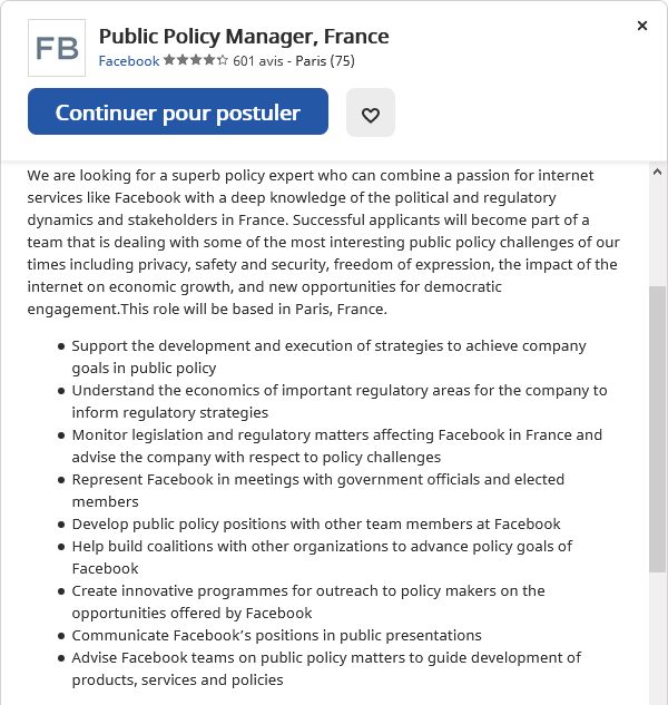 Depuis septembre 2019, le poste de Policy Manager de Twitter France est occupé par Alice Garza, ex-conseillère technique Culture, Education et Numérique du groupe LREM du Sénat. Le poste de Policy Manager consiste à effectuer d’une part une veille législative pour voir comment les lois impactent les affaires d’une entreprise et d’autre part à faire du lobbying pour influencer les lois dans un sens qui arrange l’entreprise. L’annonce ci-dessous vous fournit plus d’informations. C’est en anglais car il s’agit de Facebook et même pour son bureau parisien, on écrit anglais car les profils sont internationaux et de toute façon, c’est plus chic.