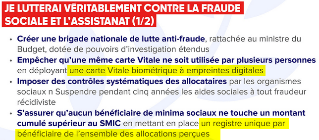 Mais pour revenir à des choses plus proches du quotidien que les réseaux de pouvoir parfois complexes, un élément en particulier dans le programme d’Eric Zemmour devrait attirer l’attention des Français, au moins de ceux qui combattent le projet mondialiste de Grande Réinitialisation, dont la dictature sanitaire n’est que la partie émergée. Elle se trouve dans le volet sur le modèle social: il s’agit de la volonté de créer une carte vitale biométrique à empreintes digitales et un registre unique par bénéficiaire de l’ensemble des allocations perçues.
